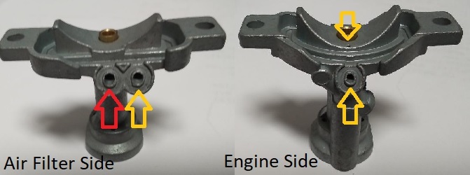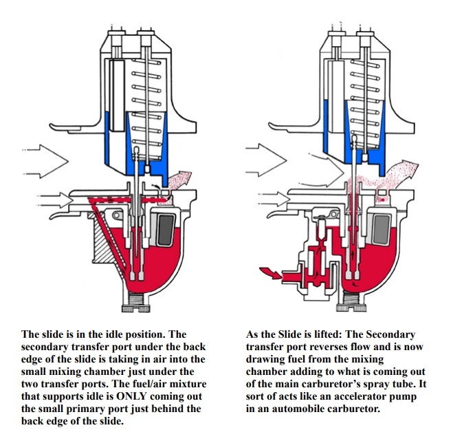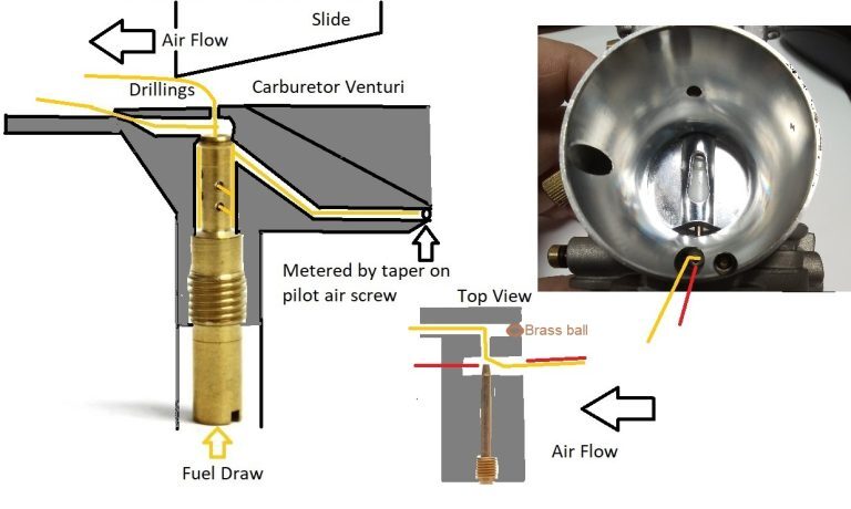 Yellow Arrows indicate the slow speed passages. Red Arrow indicates the passage which feeds the main jet for higher speed and off idle running. There are two drillings in the carb toward the rear of the slide. Both of these must be clear for the idle circuit to function. Also the cross drillings in the pilot jet must not be blocked.