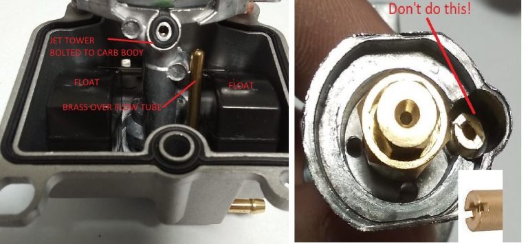 The jet “tower” has an “o-ring like” molded rubber gasket. This should be renewed when servicing this part of the carburetor. Unless you can ensure that there is no damage to the o-ring. Failure to seal will result in an air leak and idle issues. A small amount of super glue (cyanoacrylate) needs to be used to hold the gasket in the recess during assembly. Just don’t glue your fingers to together. Acetone (nail polish remover) dissolves super glue if you make a mistake.