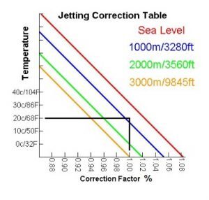 For higher elevation 4000 ft +jetting deduct correction factor from the jet size. Round up to the nearest size.