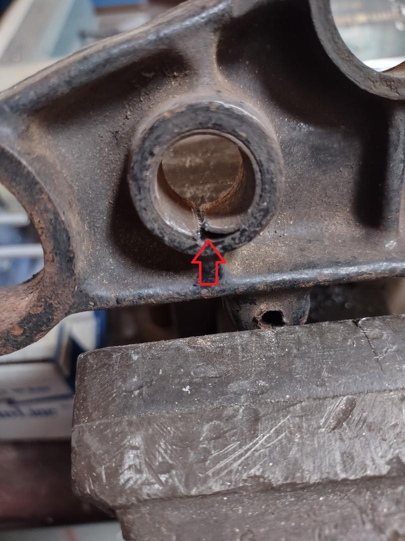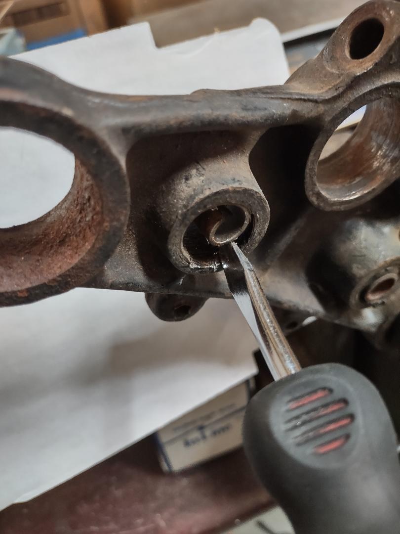 First you need to cut the bushing sleeve. Try to not cut the triple clamp if you can. A hacksaw does this job well. The goal is to collapse the bushing sleeve to restore the hole to the original size (.750 or 3/4 inch). Once cut a flat blade screw driver or pointed metal punch can be used. Using a twisting motion rather than prying seems to be the most effective. See pictures below.