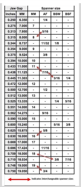 Here is a helpful wall chart that gives wrench sizes across flats. Useful for that fastener that you can’t find a spanner for.